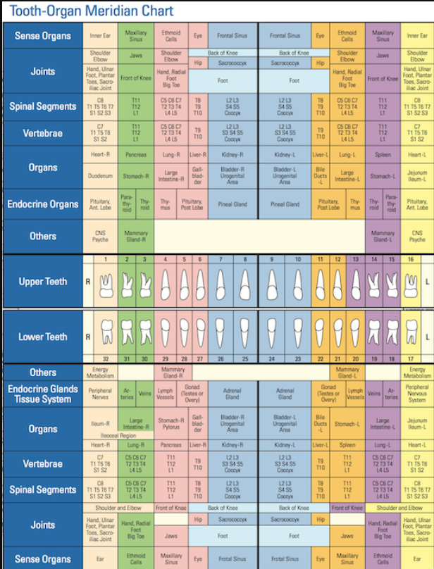 Dental Meridian chart, aka Tooth-Organ chart, shows different pathways for energy or “Qi” in our body. These energy routes are like highways connecting different body parts, glands and tissues together with our teeth. With these networks spanning throughout our body, the idea of meridian suggests that the health of one's teeth can significantly impact overall well-being. If a weakness in a particular system or organ is noted, the tooth in association to that specific body part could exacerbate the problem or show some type of symptoms.